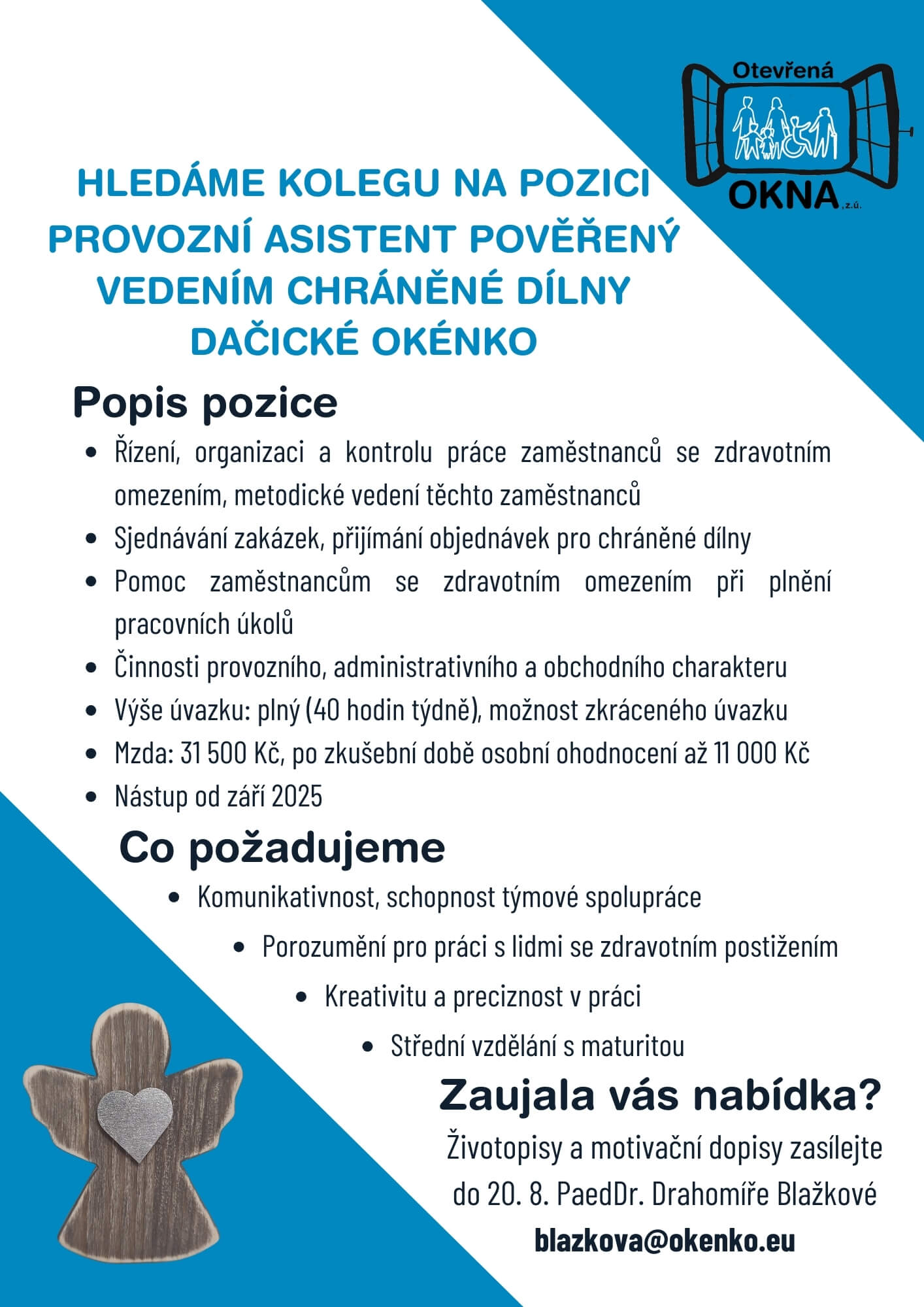do chránění dílny Dačické okénko hledáme kolegu či kolegyni na pozici provozní asistent pověřený vedením dílny.